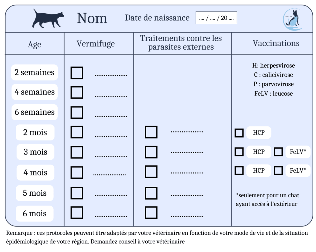 Afin de faciliter une vaccination et un traitement antiparasitaire régulier, nous avons réalisé ces pense-bêtes. Ils vous permettent de garder une trace des traitements réalisés tout au long de l’année et de penser à sa visite annuelle chez le vétérinaire. Il existe une version pour le chat adulte et une version pour le chaton. Pour chacun, vous trouverez en bas de cette page un lien pour les télécharger en version imprimable ou à remplir directement via votre ordinateur. Vous trouverez tous les rappels sur la fréquence des traitements antiparasitaires ici.