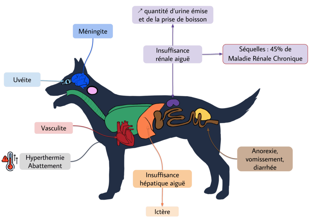 Cela cause dans un premier temps de la fièvre, de l’abattement, de l’anorexie. Puis une augmentation de la quantité d’urine émise et de la prise de boisson, des vomissements, de la diarrhée, de l’ictère “flamboyant”, pétéchies , douleurs abdominales.